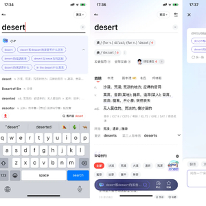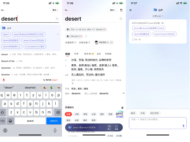 以往查单词,用户一般通过输入单词来获取释义、例句、读音等基础知识,而新版有道词典则突破了这种单一匹配的搜索模式,采用生成式搜索主动推荐相关问题,激发用户更多的探索和需求。比如说,当查询单词“desert”时,用户不仅可以随时询问“小P”,还能根据其智能推荐的问题来获取更多内容,例如“desert与dessert的发音区别”“desert相关的词语故事是什么”等等。针对用户复杂的需求,“小P”的多轮交互能力就派上了用场;通过多次来回的对话,小P能满足更个性化的问答需要,从一个单词出发学会一类知识。