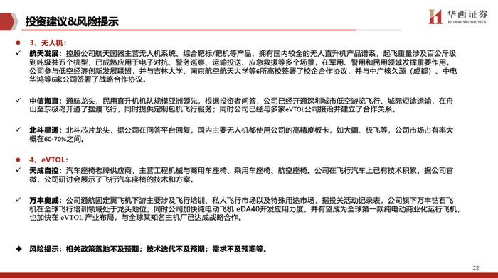 1)航天发展:控股公司航天国器主营无人机系统、综合靶标/靶机等产品,拥有国内较全的无人直升机产品谱系,起飞重量涉及百公斤级到吨级共五个机型,已成熟应用于电子对抗、警务巡察、运输投送、应急救援等多个场景,在军用、警用和民用领域发挥重要作用。公司参与低空经济创新发展联盟,并与吉林大学、南京航空航天大学等6所高校签署了校企合作协议,并与中广核久源(成都)、中电华鸿等6家公司签署了战略合作协议。