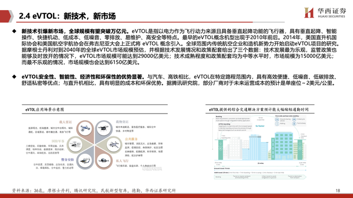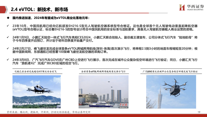 eVTOL在安全性、智能性、经济性和环保性方面具有显著优势。随着全球首张无人驾驶载人航空器系统型号合格证获批、全球首条eVTOL跨城跨湾航线开通等,国内推进加速,我们认为2024年有望成为eVTOL商业化落地元年。