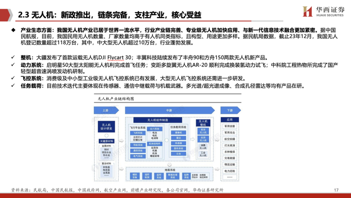无人机是低空经济支柱产业,低空飞行的主要载体即是无人机。目前我国无人机政策日益完善,产业链条日益完备,为低空经济发展提供基础条件。随着空域、航线规划进一步落实,现有农林牧渔、测绘、应急等主要应用需求将进一步释放,城市物流、载货、载人等新型应用场景也将拓宽。无人机产业链将是低空经济发展核心受益环节。
