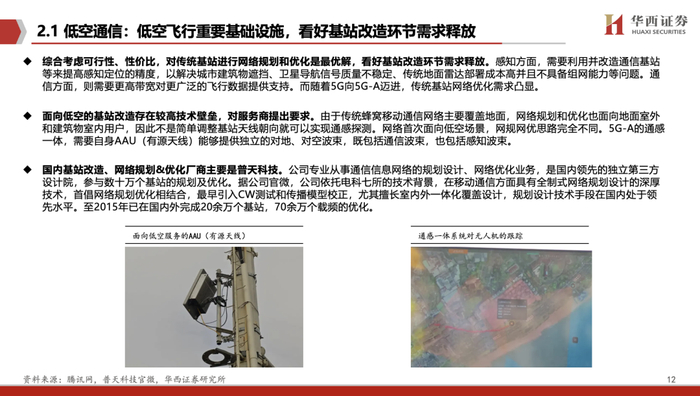 低空通信网络是低空飞行的重要基础设施,对低空经济规模化发展起决定性作用,无论是低空监管平台与无人机机载数据的实时回传,还是无人机的长距离飞行远程操控,都依赖可靠的通信网络。综合考虑可行性、性价比,对传统基站进行网络规划和优化是最优解,看好基站改造环节需求释放。同时,面向低空的基站改造存在较高技术壁垒,低空场景的网规网优思路完全不同,对服务商能力提出要求。