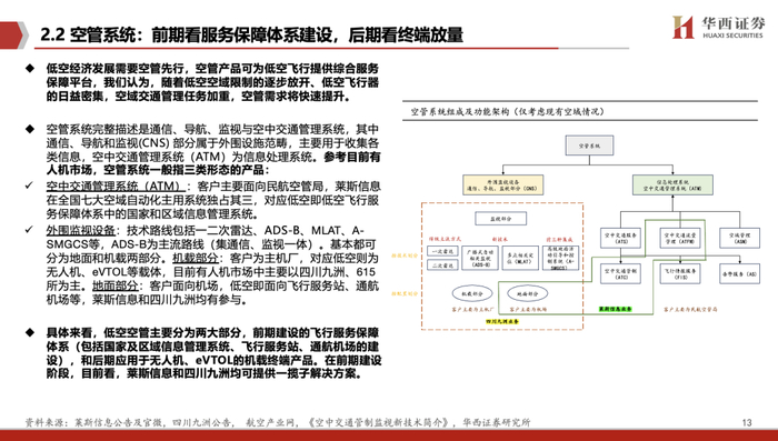 2)莱斯信息:国内空管自动化系统龙头。低空方面,据公司官微,公司为飞行服务站、通航机场、通航公司等企事业单位提供整体解决方案、核心产品和技术服务。2020年,公司承建江苏省首个A类飞行服务站,提供了涵盖通航飞行服务信息系统、ADS-B地面站、内话、VHF甚高频电台的一揽子解决方案。此后,公司先后承担了江苏徐州、安徽合肥等地以飞行服务站为核心的通航机场建设任务。此外,公司于2021年展出通航飞行服务系统,覆盖国家、区域、飞行服务站三级通航飞行服务保障体系。