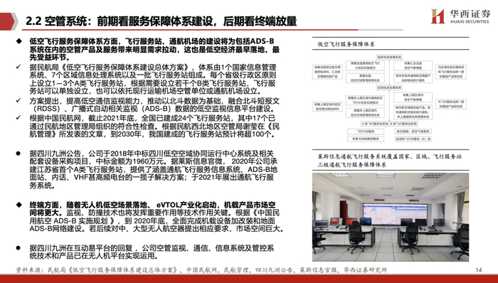 低空经济发展空管先行,我们认为,随着低空空域限制的逐步放开、低空飞行器的日益密集,空域交通管理任务加重,空管需求将快速提升。前期主要看低空飞行服务保障体系(飞行服务站、通航机场等)的建设带来的对包括ADS-B系统在内的空管产品及服务的需求;后期随着无人机低空场景落地、 eVTOL产业化启动,机载终端产品市场空间将更大。