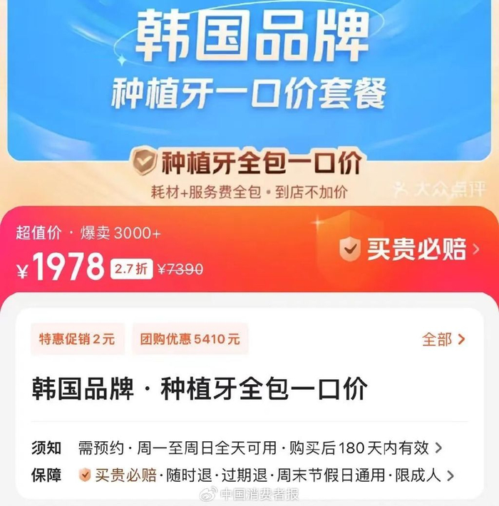 记者在平台搜索“种植牙”,看到不少口腔医疗机构团购套餐的价格格外吸睛。其中,松鼠口腔医院·中山种牙·矫正中心的“韩国品牌,种植牙一口价套餐”显示售价为1978元,并重复强调“种植牙全包一口价”,小字标注有“耗材+服务费全包+到店不加价”。记者询问客服是否为一口价、是否还有其他收费时,对方没有明确答复,仅表示“种植牙需要先到院拍片面诊才能评估确认方案”。记者进一步询问多颗牙能否按照1978元的价格种植,客服称“这是新诊到院享受首颗的优惠活动”。