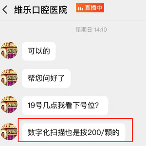浙江杭州消费者李女士告诉记者:“我在线上咨询了维乐口腔上海杨浦五角场店客服,对方表示临时牙冠可以当天制作完成,200元一颗。但到达维乐口腔门店后,医生告诉我每颗牙需要1500元,这和最初客服所说价格相差甚远。”