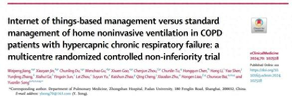 2024年3月10日,复旦大学附属中山医院呼吸与危重症学科的白春学,宋元林教授联袂清华大学医学院廖洪恩教授于柳叶刀子刊《电子临床医学》(《eClinicalMedicine》)(IF 15.1)在线发表了题为“基于物联网管理的家庭无创正压通气治疗COPD合并慢性呼吸衰竭的多中心随机对照前瞻性研究”的研究成果。