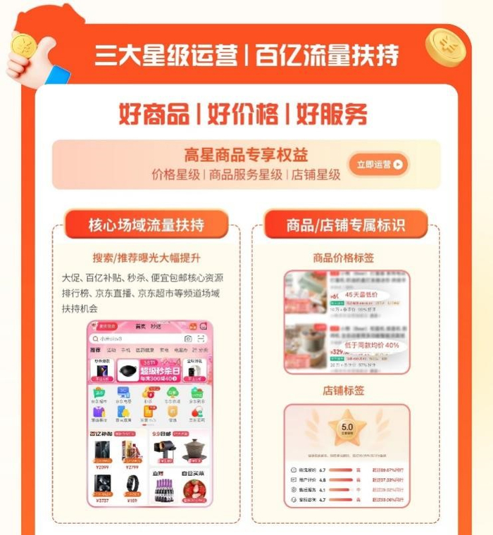 其二是流量更易得。京东“春晓计划”升级后, 商家可利用“价格星级”工具,依据京东指导价调整价格,自动提升商品的曝光度和竞争力。同时,京东推出的“店铺星级”和“商品服务星级”工具旨在帮助商家优化用户体验,星级较高的商家将获得核心场域流量扶持,同时有机会获得专属标识。