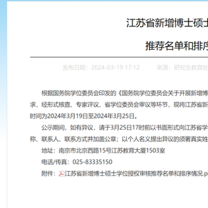 原标题:江苏省公布新增博士硕士学位授权审核推荐名单和排序情况