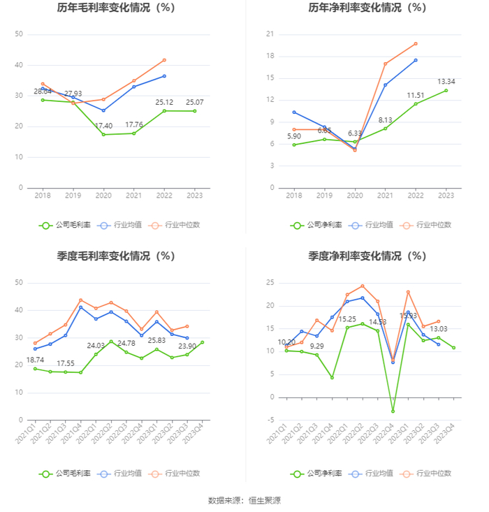 2023年,公司毛利率为25.07%,同比下降0.05个百分点;净利率为13.34%,较上年同期上升1.83个百分点。从单季度指标来看,2023年第四季度公司毛利率为28.39%,同比上升5.79个百分点,环比上升4.49个百分点;净利率为10.85%,较上年同期上升13.92个百分点,较上一季度下降2.18个百分点。