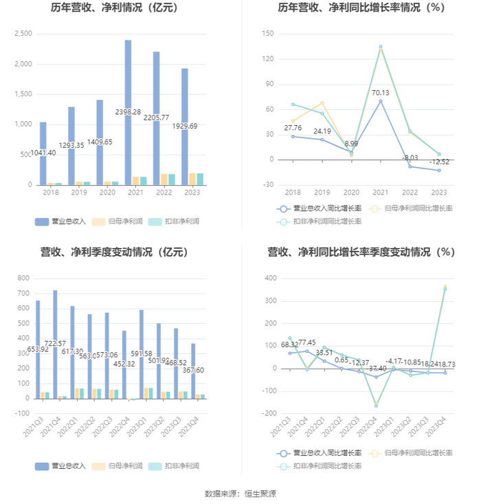 中证智能财讯 中煤能源(601898)3月21日披露2023年年报。2023年,公司实现营业总收入1929.69亿元,同比下降12.52%;归母净利润195.34亿元,同比增长6.98%;扣非净利润193.64亿元,同比增长6.80%;经营活动产生的现金流量净额为429.65亿元,同比下降1.53%;报告期内,中煤能源基本每股收益为1.47元,加权平均净资产收益率为14.21%。公司2023年年度利润分配预案为:拟向全体股东每10股派4.42元(含税)。
