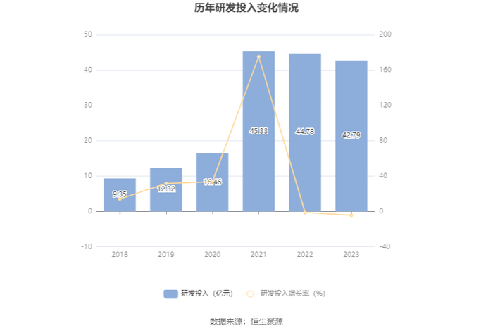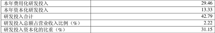 2023年全年,公司研发投入金额为42.79亿元,同比下降4.44%;研发投入占营业收入比例为2.22%,相比上年同期上升0.19个百分点。此外,公司全年研发投入资本化率为31.15%。