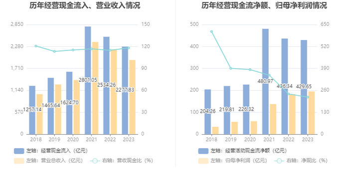 2023年,公司经营活动现金流净额为429.65亿元,同比下降1.53%;筹资活动现金流净额-262.98亿元,同比减少36.11亿元;投资活动现金流净额-150.57亿元,上年同期为-220.46亿元。
