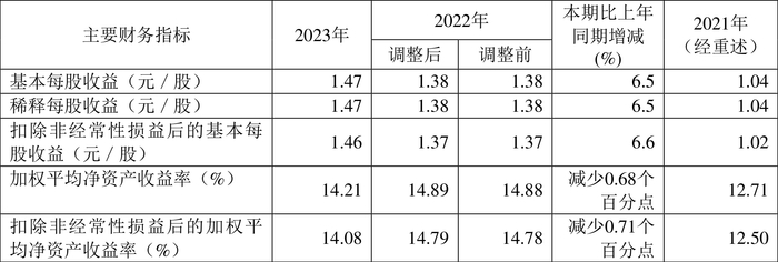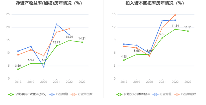 数据显示,2023年公司加权平均净资产收益率为14.21%,较上年同期下降0.68个百分点;公司2023年投入资本回报率为11.11%,较上年同期下降0.43个百分点。