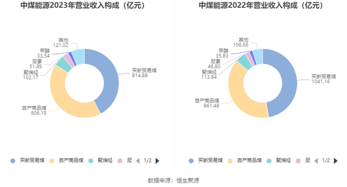 分产品来看,2023年公司主营业务中,买断贸易煤收入814.88亿元,同比下降21.73%,占营业收入的42.23%;自产商品煤收入806.19亿元,同比下降6.4%,占营业收入的41.78%;聚烯烃收入102.17亿元,同比下降10.25%,占营业收入的5.29%。