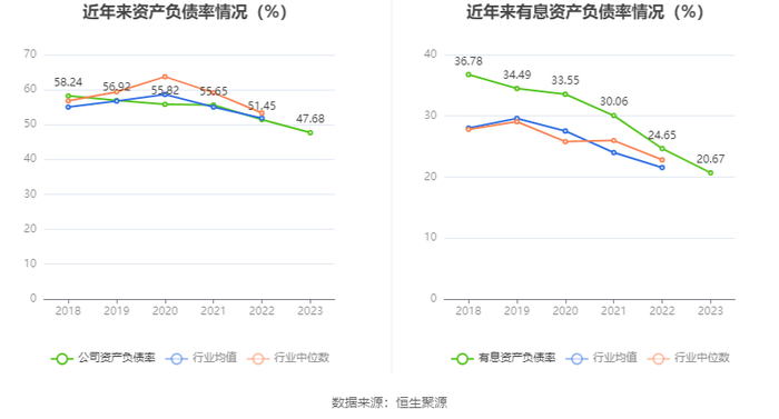 在偿债能力方面,公司2023年年末资产负债率为47.68%,相比上年末下降3.77个百分点;有息资产负债率为20.67%,相比上年末下降3.98个百分点。