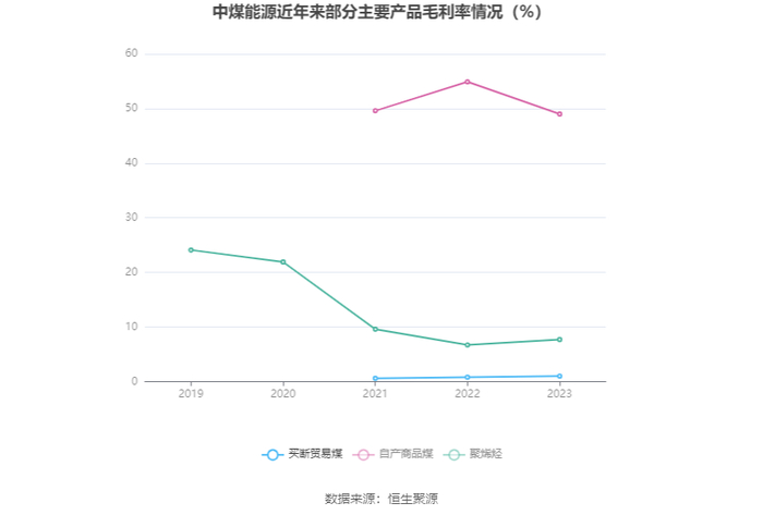 分产品看,买断贸易煤、自产商品煤、聚烯烃2023年毛利率分别为1.00%、49.00%、7.70%。