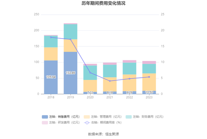 2023年,公司期间费用为104.13亿元,较上年同期减少2.62亿元;但期间费用率为5.40%,较上年同期上升0.56个百分点。其中,销售费用同比增长13.0%,管理费用同比增长3.92%,研发费用同比增长18.76%,财务费用同比下降19.66%。