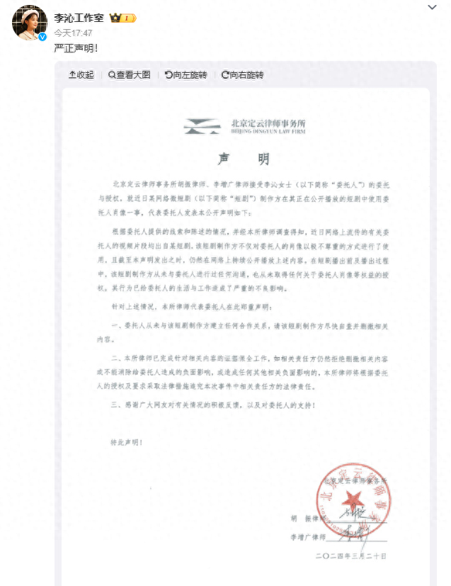 今(20)日,李沁工作室发布律师声明称,该短剧制作方对李沁的肖像以极不尊重的方式进行了使用,在短剧播出前及播出过程中,从未与李沁方进行过任何沟通,也从未取得任何关于肖像等权益的授权。