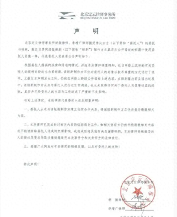 3月20日傍晚,李沁工作室发布律师声明,称经律师调查,该短剧制作方不仅对李沁的肖像以极不尊重的方式进行了使用,且截至声明发出,仍在网络上持续公开播放相关内容。在短剧播出前及播出过程中,该短剧制作方从未与委托人进行任何沟通,也未取得任何关于委托人肖像等权益的授权。声明要求该短剧制作方尽快自查并删撤相关内容。经记者检索,截至发稿时该短剧已在首发的某短剧平台中下架,但仍在多个盗版短剧账号中正常播放,此外,该片段中出现了四张黑白照片,除了被认定为李沁的一张外,还有一张被网友质疑为著名演员牛犇的照片。