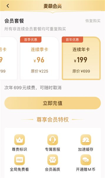 年卡首年199元,次年会变成699元。