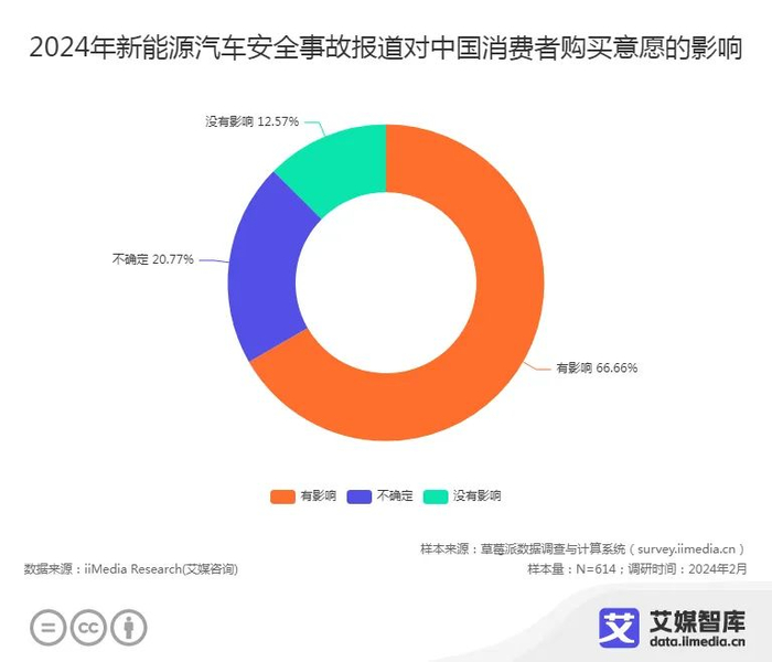 消费者对新能源汽车的接受度也受安全事故和技术成熟度的影响。近两年来,多批已发售车辆被召回、安全事故频发等现象致使部分消费者对制造商的技术能力和产品质量控制产生质疑,极大程度上影响了消费者的消费诉求,有66.66%的消费者购买新能源汽车的意愿遭到相关安全事故报道的冲击。