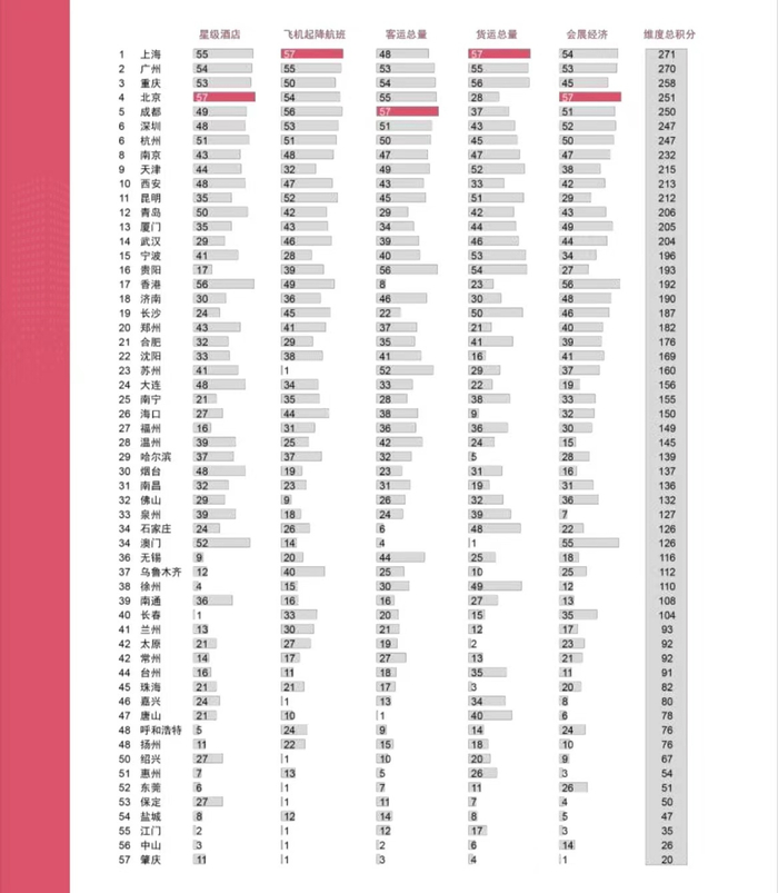 在十个维度中,“区域重要城市”维度包含五个变量:星级酒店、飞机起降航班、客运总量、货运总量和会展经济。这些指标从区域协调性的角度综合考察了城市对周边地区和城市的影响力以及辐射带动作用,这对构建新发展格局具有重要参考意义。