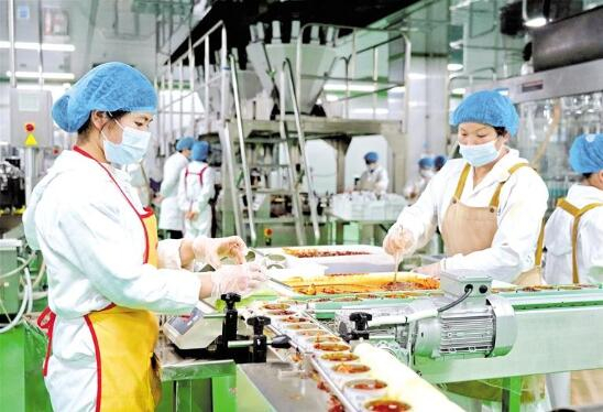 贵州百凤庭食品有限公司依托纳雍县生态家禽、食用菌、辣椒、魔芋、肉牛等产业优势,大力发展精深加工,拥有6条自动化罐装食品生产线,年产能3600万罐,年产值2.88亿元。图为生产线上工人正在罐装辣子鸡。杨英 摄(贵州图片库发)