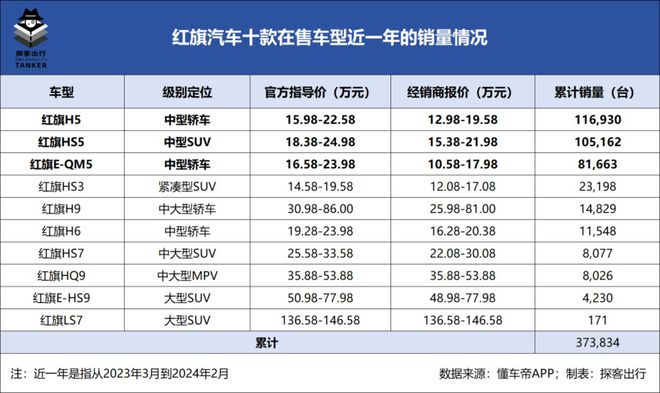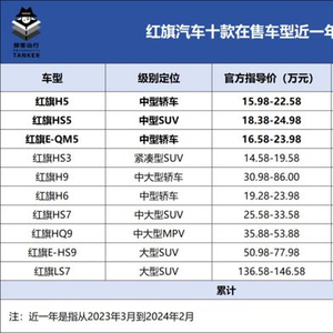 「探客出行」从懂车帝数据获悉,截至2024年3月中,红旗汽车在售车型共计十款。在过去的一年(2023年3月-2024年2月)中卖得最好的三款车分别是H5(中型轿车)、HS5(中型SUV)以及E-QM5(中型车纯电),其累计销量达30.38万台,占十款在售车型总销量的81.25%,且这三款畅销车型的售价将主要集中在15万元上下。