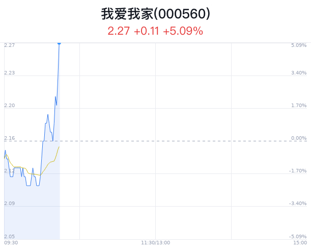 03月21日,我爱我家(000560)股价大幅上涨,截至10点13分,我爱我家上涨5.09%,报2.27元/股,创近2月新高,成交1.17亿元,换手率2.41%。