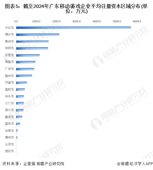 根据中国企业数据库企查猫,截至2024年2月,广东移动游戏企业的平均注册资本区域分布中,中山相关企业的平均注册资本最高,为5699.5万元,除此外,佛山、惠州和深圳的移动游戏企业平均注册资金均较高。