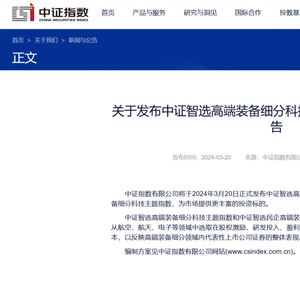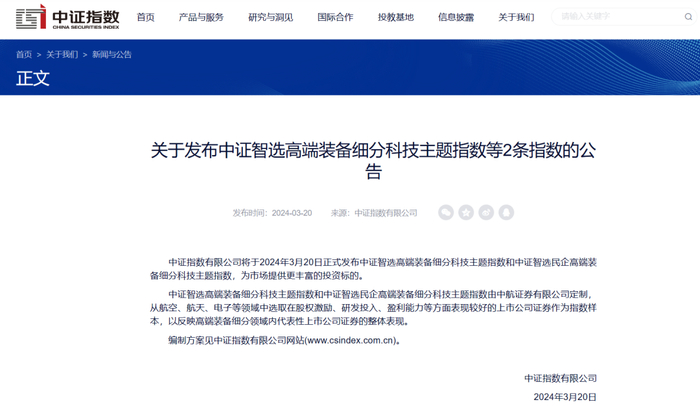 3月20日,中证指数公司公告,正式发布两只由中航证券定制的指数,分别为中证智选高端装备细分科技主题指数(以下简称“高端装备科技指数”,代码932044)和中证智选民企高端装备细分科技主题指数(以下简称“民企高端装备指数”,代码932048)。