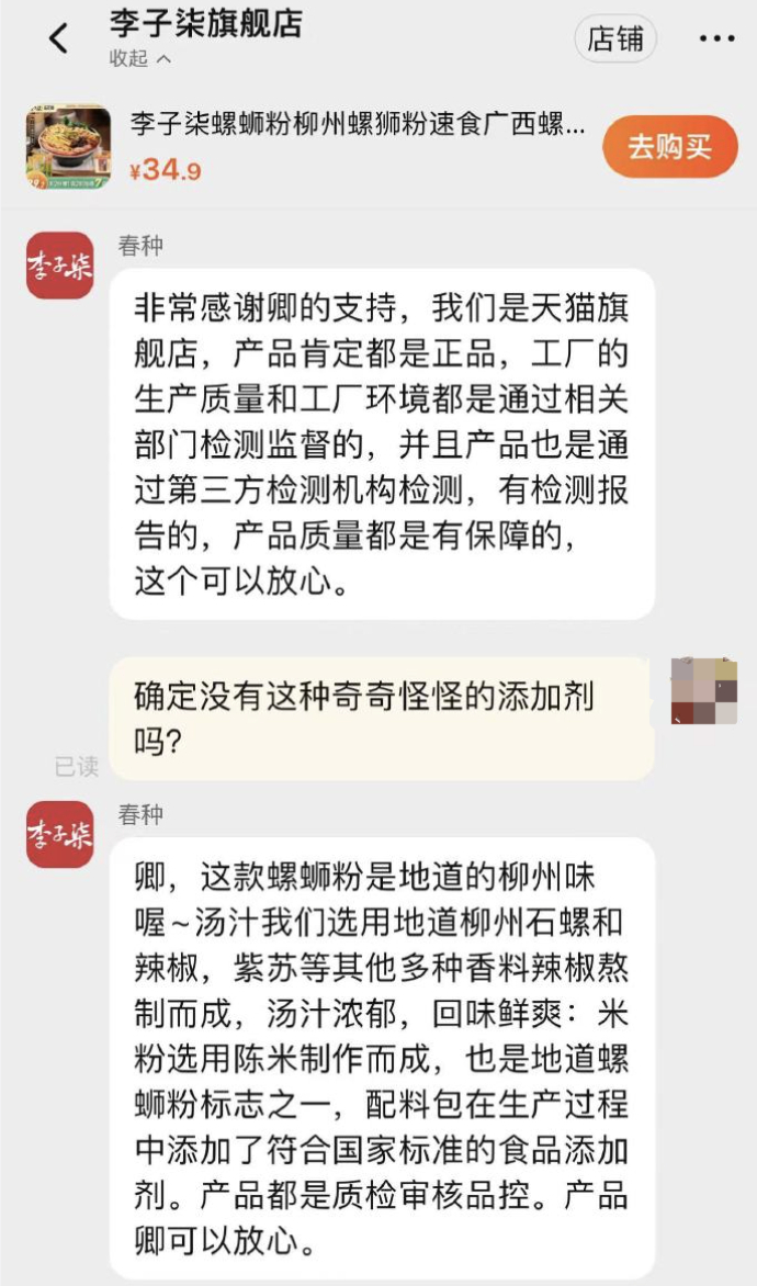 李子柒旗舰店客服回应称:产品肯定都是正品,工厂的生产质量和工厂环境都是通过相关部门检测监督的,并且产品也是通过第三方检测机构检测,有检测报告的,产品质量都是有保障的, 这个可以放心。