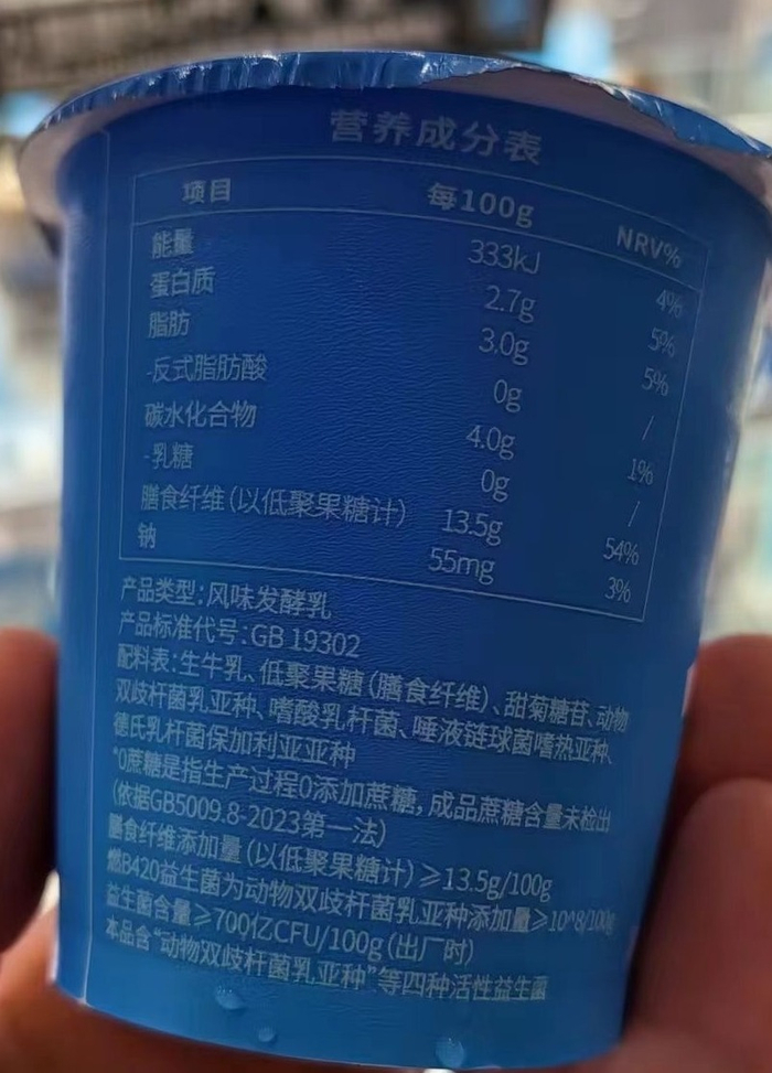 记者从“小蓝瓶1号”的包装看到,每杯的膳食纤维(以低聚果糖计)添加量至少13.5克、益生菌含量至少700亿。这也意味着,标准版“畅”派酸奶每杯含有至少40.5克膳食纤维,高阶版含有至少54克膳食纤维。