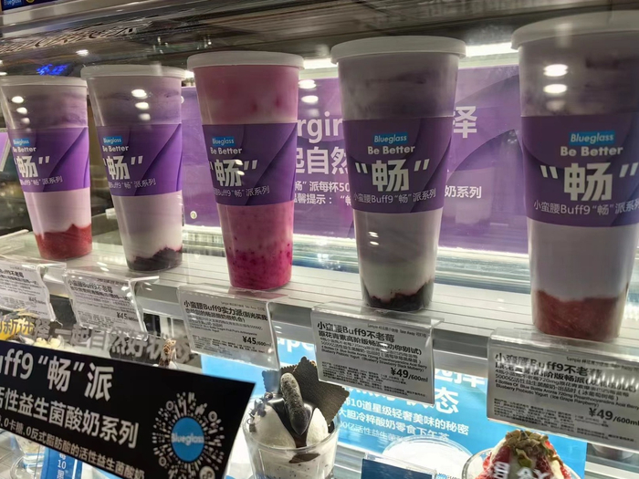3月20日,读特新闻记者查询和走访位于深圳福田区的几家Blueglass门店,看到店里都有销售“畅”派酸奶。产品标签显示,“畅”派酸奶有几种不同口味,主要分为标准版和高阶版,每杯含有5000亿活性益生菌。