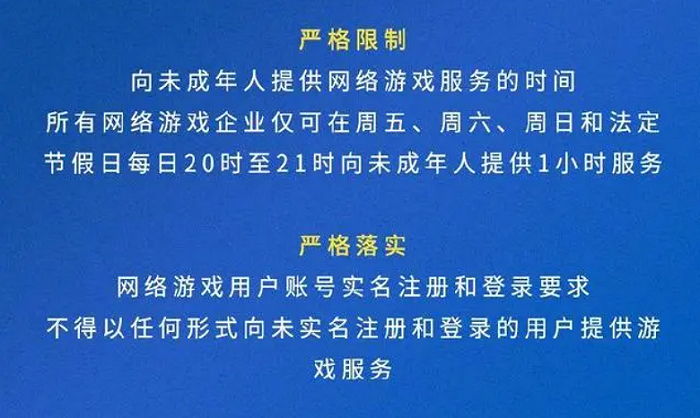 2021年,游戏防沉迷措施迎来重大升级。国家新闻出版署颁布的《关于进一步严格管理切实防止未成年人沉迷网络游戏的通知》严格要求所有网络游戏企业仅可在周五、周六、周日和法定节假日的每日20时至21时,向未成年人提供1小时服务。