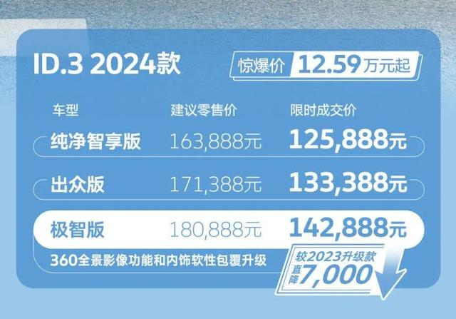 此阶段竞品上新导致终端优惠力度减小,对于ID.3来说是一个进一步扩大市场销量的好机会。记者也看到在ID.3的这项购车政策宣传上有注明1.99万元超低首付活动是仅限纯净智享版,而另外两个高配版本的车型实际也是有相应政策的,首付金额和月供会略高一些,但在终端并没有相关内容的展示,终端的主销车型依然是纯净智享版。
