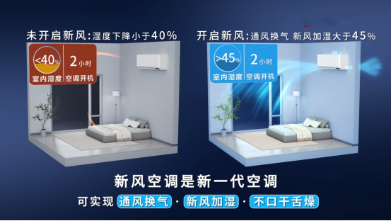 据了解,密闭环境下,病毒、细菌、PM2.5、TVOC也会不断增加,而根据测算,每个人一天呼吸2万次,吸入15~20立方米空气。随着现代人越来越越关注健康,人们也越来越关注空调在密闭空间使用时室内空气质量对人体的影响。很多人睡醒后仍有头昏脑胀、口干舌燥的感受,这都是因为在密闭房间内,空气流通性太差,尤其是室内湿度下降、二氧化碳浓度增加,空气变得不新鲜。新风空调通过引入室外新鲜空气,有效改善室内空气品质,提升空气浓度,减少二氧化碳浓度,提高氧气含量。
