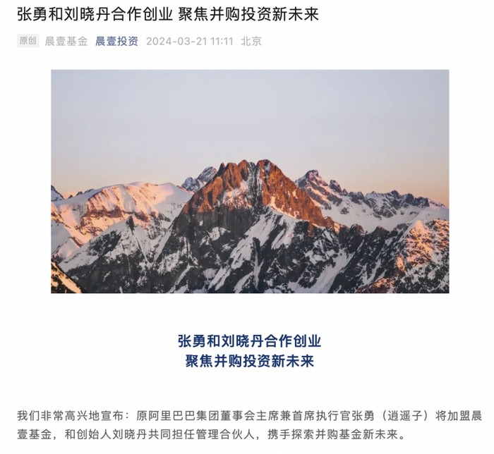 3月21日午间,晨壹基金微信公众号“晨壹投资”宣布了张勇和刘晓丹合作创业的消息。