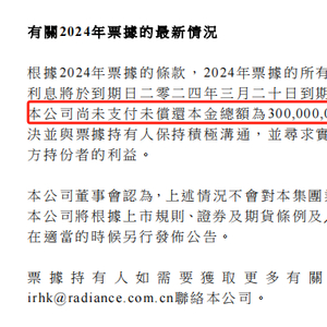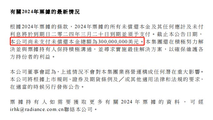 3月20日晚,金辉控股公告称,尚未支付2024年到期、票面利率7.8%票据的未偿还金额,本金总额3亿美元。