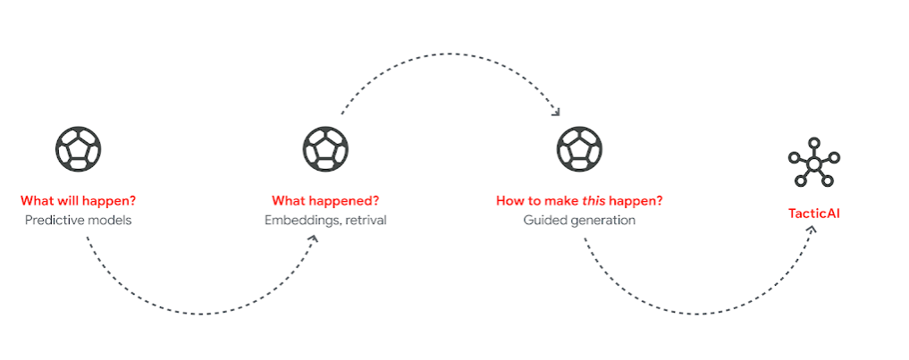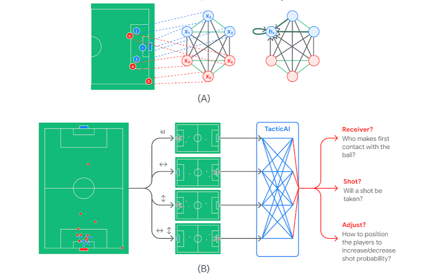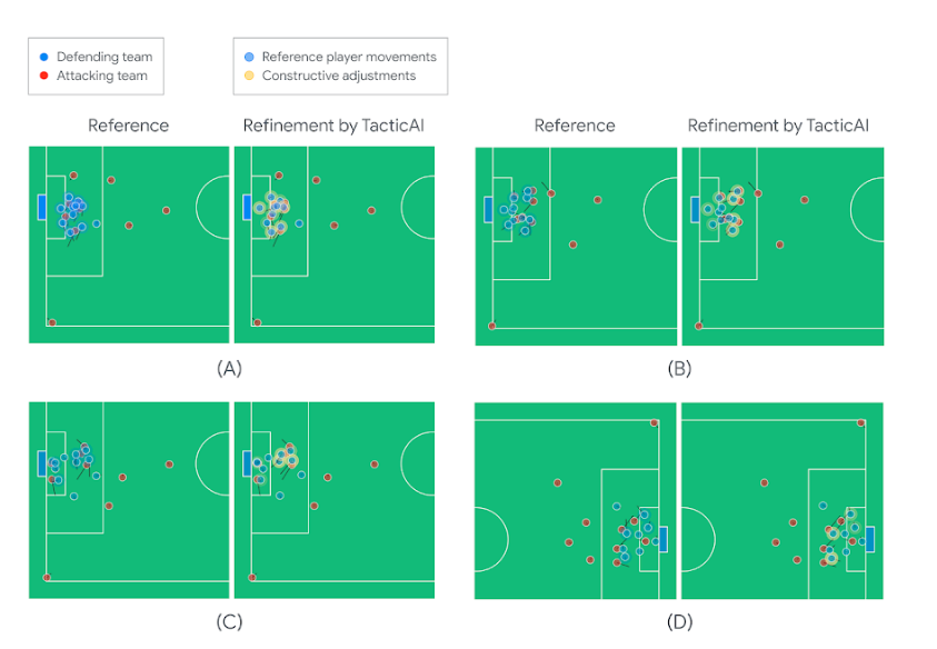传统上,为了制定战术和反制对方的战术,足球数据分析师会观看许多比赛视频,寻找类似的案例并研究对手球队。而TacticAI可以自动计算和归纳球员的过往数据,让数据分析师可以轻松高效地查找相关的过往例证。TacticAI还可提供战术建议,调整特定球队所有球员的位置。从这些调整建议中,人类教练可以更快地识别战术优劣,以及攸关战术成败的关键球员。