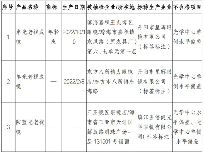 新海南客户端、南海网3月21日消息(记者 蒙健)老视成镜又称老花镜,是由生产单位批量生产加工完成后,在眼镜店中出售的有现成光度的配装眼镜。近日,海南省市场监督管理局对全省流通市场的单光老视成镜产品进行了省级监督抽查,本次检验依据XZ28-2023《海南省单光老视成镜产品质量监督抽查实施细则》、GB/T13511.3-2019配装眼镜第3部分:单光老视成镜。主要检验镜架的材料和表面质量、镜架的外观质量、两镜片顶焦度互差、光学中心水平偏差、光学中心单侧水平偏差、光学中心垂直互差等。此次共抽检产品20批次,不合格3批次,不合格率为15%。不合格项目为光学中心水平偏差、光学中心单侧水平偏差。不合格产品包括: