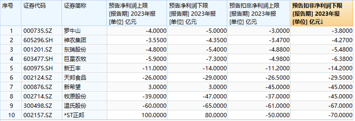10家上市公司中,扣非净亏损最少的为罗牛山,2023年预计亏损3亿元-3.8亿元之间;扣非净亏损最严重的则是*ST正邦,其预计扣非后净亏损50亿元-70亿元左右。