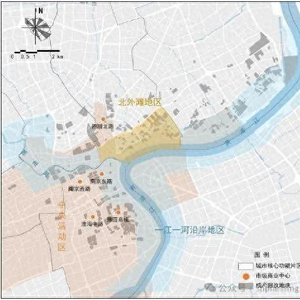 上海本轮旧改的地块用地功能分布来源:笔者自绘。区域层面上,对于上海的城市重要功能板块,如“一江一河”沿线、市级商业和公共活动中心、公共交通轴线等地区,以旧改地块为引领,以点带面,从更高视野强化区域的公共核心、功能轴线、空间廊道等结构性要素。以中国近现代重要的工业基地——杨浦滨江南片区为例,作为中央活动区组成部分与黄浦江沿线重要区段,片区定位为宜业、宜游、宜居的世界级滨水城区。成片旧改在历史建筑适建性分析的基础上,围绕八埭头、大桥东两处区域功能核心,依托原有历史建筑形制,布局商业酒店、创意办公、公共服务等复合功能;在滨江创意产业带沿线点状植入教育设施、租赁住宅、特色商业等服务功能,营造绿色共享的“人民城市”活力示范。