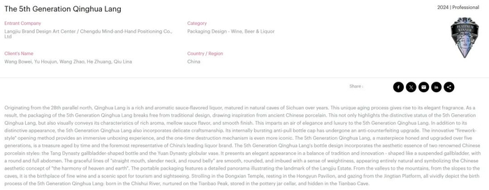 面向未来 走向世界 第五代青花郎荣获美国MUSE设计奖最高荣誉
