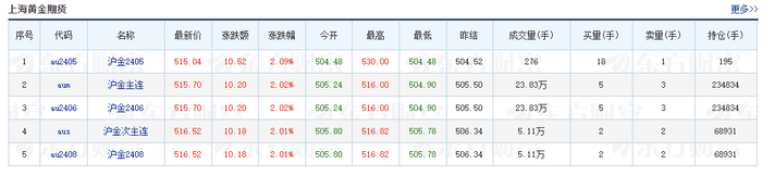期货市场上,国内黄金板块纷纷上涨。截至3月21日18时,沪金2406涨跌幅达2.02%,最新报价515.7元/克,最高涨至516元/克,成交量超23万;沪金2408涨跌幅达2.01%,最新报价516.52元/克,成交量5.11万。