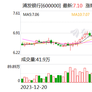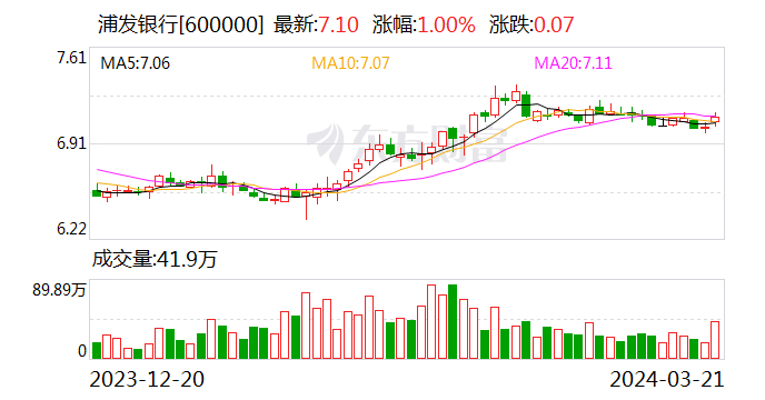 二级市场方面,年初至今,银行股走出一波普涨行情。截至3月21日,14家上市银行区间涨幅超10%,浦发银行区间涨幅为7.25%。当日收盘,浦发银行涨1%,报7.10元/股,总市值2084亿元。