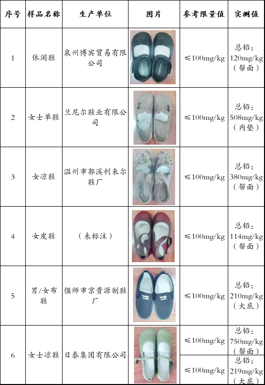 6批次样品重金属(总铅)含量检测结果参照ZDHC(有害化学物质零排放联盟)MRSL 3.1超出参考限量值要求,分别是:泉州博宾贸易有限公司的休闲鞋、兰尼尔鞋业有限公司的女士单鞋、温州市郭溪利来尔鞋厂的女凉鞋、(未标注)生产单位的女皮鞋、偃师市京贵源制鞋厂的男/女布鞋和日泰集团有限公司的女士凉鞋。