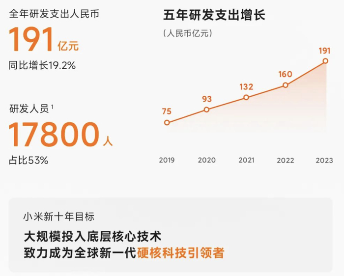 而小米集团为了“新十年目标”也加大了研发上的投入。2023年,小米集团的研发支出达到191亿元,同比增长19.2%。截至2023年12月31日,小米集团的研发人员数达到17800人,占员工总数53%。