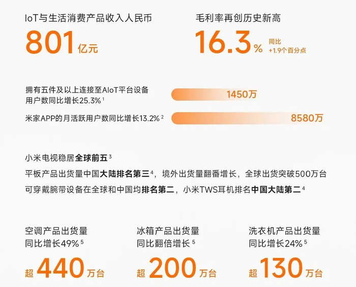 2023年,小米集团的IoT与生活消费产品业务收入和毛利率均实现同比增长,2023年全年,IoT与生活消费产品业务收入为801亿元,同比增长0.4%,毛利率为16.3%,创历史新高,同比提升1.9个百分点。仅2023年第四季度,IoT与生活消费产品收入就达到203亿元。