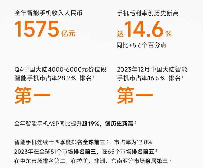根据第三方数据,2023年,小米在中国大陆地区4000–6000元价位段的智能手机市占率达到16.9%,同比提升9.2个百分点;2023年第四季度,小米该价位段的智能手机销量排名第一,市占率达到28.2%。价格方面,2023年,小米在中国大陆地区智能手机平均售价同比提升超过19%,创历史新高。